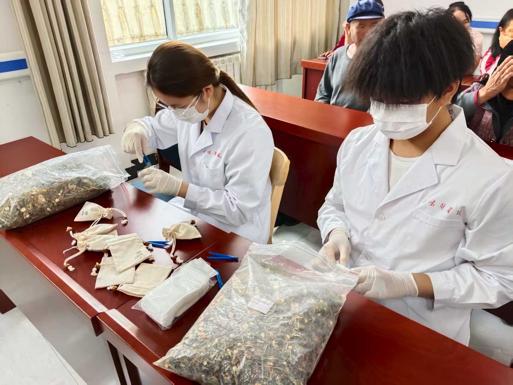 实践团聚焦当地乡村医疗资源薄弱、留守老人慢性病高发的突出问题,依托中医药“简、便、廉、验”的独特优势,将医疗服务做深做实,直抵村民心坎。7月12日进驻和政县养老院时,队员们不仅为每位老人建立个性化健康档案,还特意开设《中医四季养生法》等讲座。讲台上,队员们耐心拆解养生要点;讲台下,他们手把手教老人练八段锦,动作舒展间,老人们脸上露出了笑容。更暖心的是,队员们带来药材,带着老人一起制作驱蚊、安神香囊,两位队员一边示范配制药材,一边细致讲解“艾叶驱蚊、薰衣草安神”的原理,范文艳则拿着做好的香囊,逐一向老人说明用法和注意事项,让老人们在动手实践中读懂中医“治未病”的智慧。