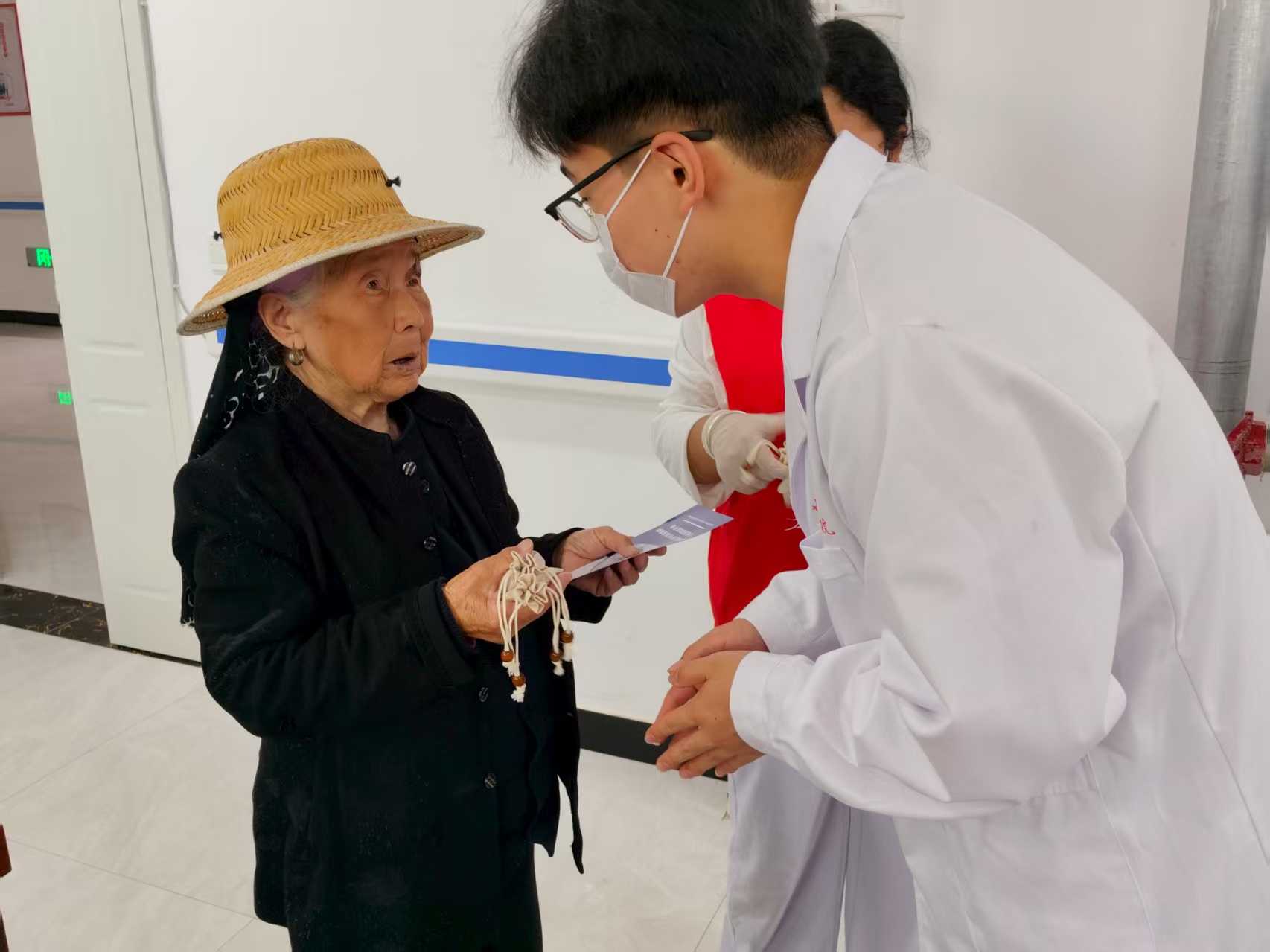 在三十里铺村的义诊现场,天微亮时,队员们便已准备好了义诊所需的物品。村民们也揣着检查表,早早排起长队,眼中满是期待。队员傅凯嘉看着这一幕,瞬间读懂了乡村对优质医疗的迫切需求。她和队友们分工协作,专注地为居民量血压,不时叮嘱“血压有点高,平时要少盐”;擅长推拿的队员则围坐成圈,为颈肩不适的村民缓解疼痛,结合村民日常劳作的习惯,讲解“避免长时间弯腰劳作,每小时起身活动肩颈”的养护常识,还现场教学简单按摩手法。遇到行动不便的老人,队员们组成三人服务小组,主动上门,带着风油精、板蓝根等常备药品,一对一进行健康指导。“在家门口就能享受到贴心服务,这些娃娃比亲人还周到!”一位老人握着队员的手感慨道。据统计,活动期间累计服务老人300余人次、居民400余人次,建立健康档案400余份,发放健康资料超500份。