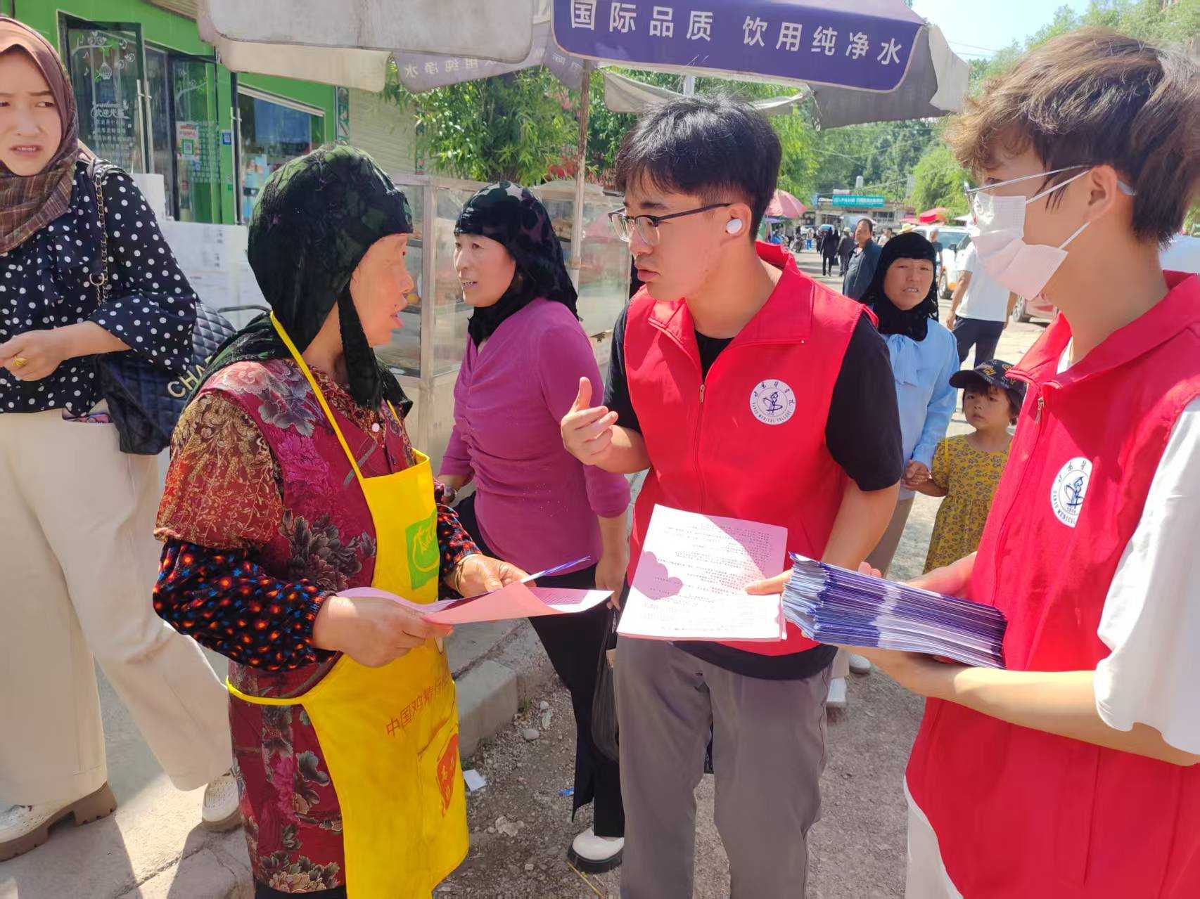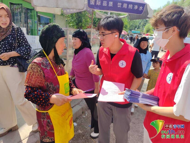 图为实践队员给居民发放宣传单。郭星宇 供图