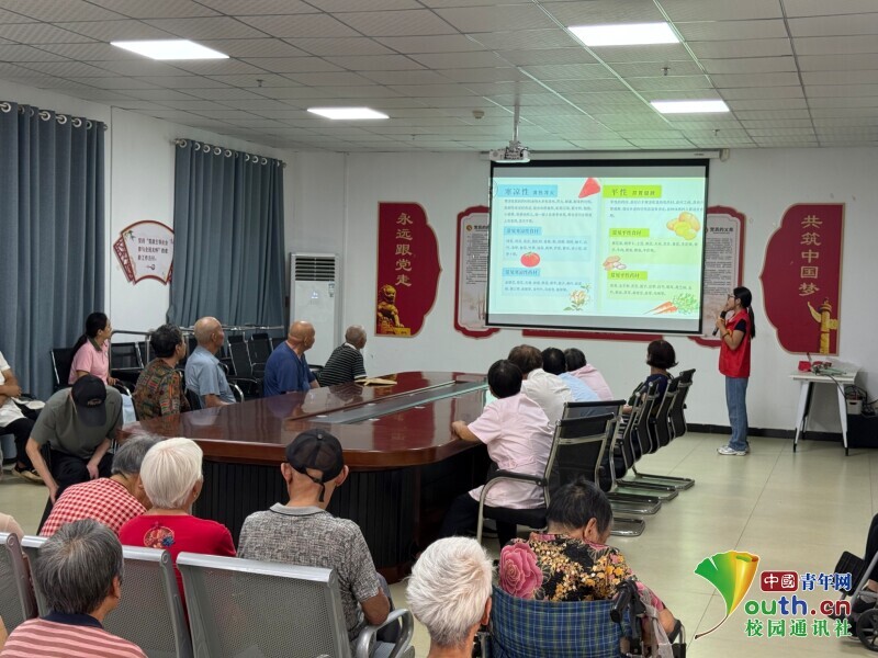 图为郑州大学实践队成员宋雨佳为老年人讲解 “食物五性” 知识。华晔 供图