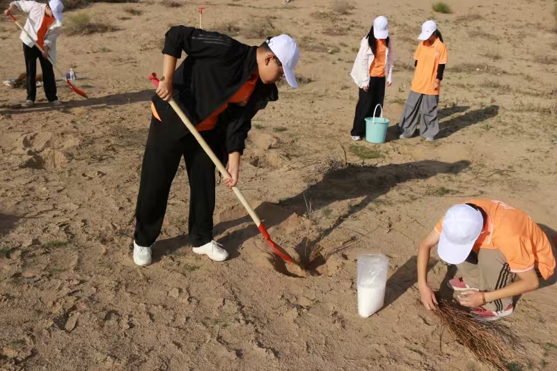 盛夏七月,骄阳似火,为响应国家生态文明建设号召,深入践行“绿水青山就是金山银山”理念,7月16日至20日,一支由兰州理工大学师生组成的实践团队走进甘肃民勤,以“治沙护绿 青春同行”为主题开展暑期实践活动。固水育绿实践团队锚定“技术实践—精神传承—成果推广”的核心目标,通过系统化的种树、实验、研学及培训行动,在沙漠中播撒绿色希望,用科学方法探索治沙路径,以实际行动延续治沙精神。