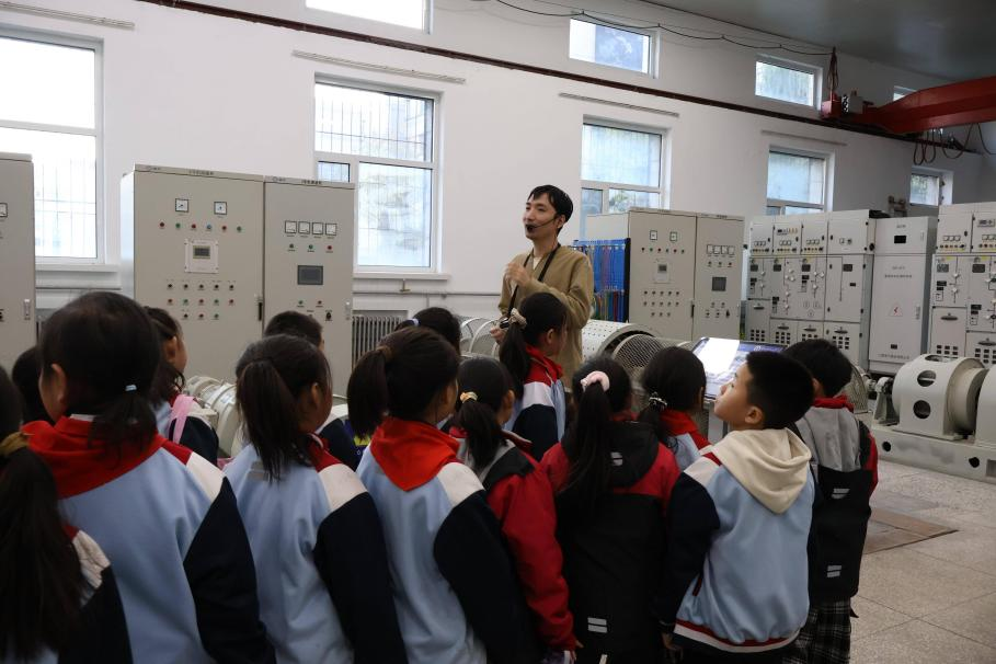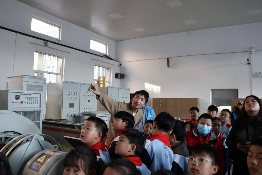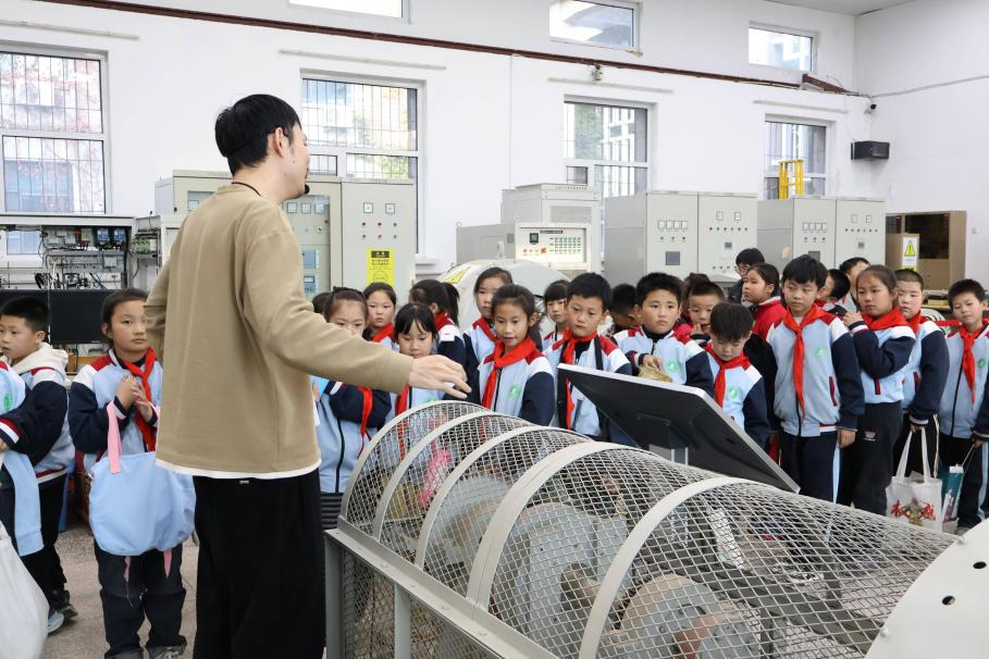 在模拟装置展示环节,实验室的科研人员借助先进的电力系统动态模拟设备,向学生们直观呈现了电力的产生、传输、分配全过程。复杂的线路、闪烁的指示灯、不停运转的模拟部件瞬间吸引了所有学生的目光,他们纷纷围在实验设备旁,踮起脚尖仔细观察,生怕错过任何一个细节。科研人员用通俗易懂的语言,将抽象的电力原理转化为生动的生活案例,“大家平时家里用的电,就是通过类似这样的系统,从发电厂输送到千家万户的。这个小小的模拟汽轮机,就相当于发电厂里的‘动力心脏’,它转动起来就能带动发电机产生电能。”