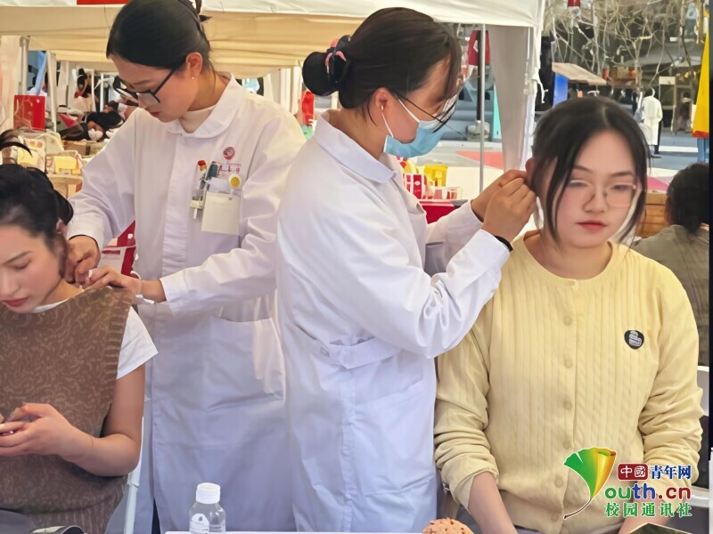 图为医护志愿者在社区文化广场为居民进行耳穴压丸治疗。方文发 供图
