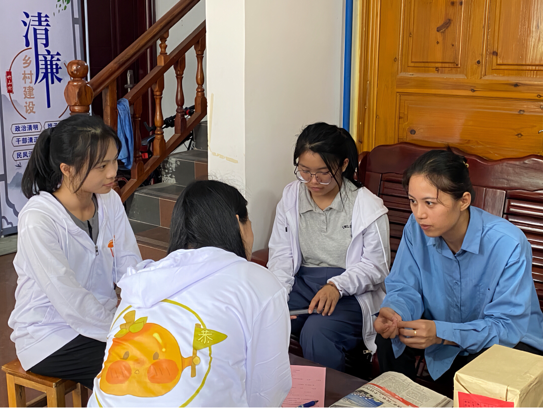次日,在崇岭村赵书记的协助下,实践队来到崇岭村发放调查问卷,了解种植月柿的经济收益、影响因素、未来发展方向等内容,在与村民攀谈中了解到月柿产业发展的问题和挑战。第一,月柿价格受到天气、市场等多种因素影响,近年来,种植月柿的规模不断扩大,来到恭城收购月柿的老板数量增加了,但供大于求,月柿价格相较于前些年,是偏低的;二、月柿可以被加工称柿饼、柿子醋、柿子茶、柿子饮料等副产品,但大多数村民直接采摘月柿进行售卖,并不具备深加工柿子的能力;三、盲目追求月柿的产量,但忽视了质量,导致月柿品质不高。