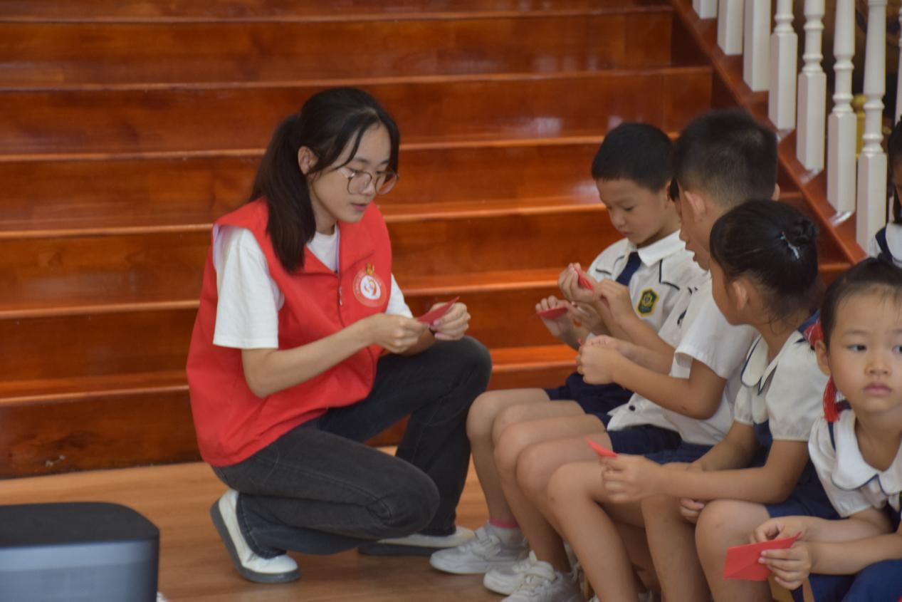图为志愿者与小朋友折红色五角星。潘佳意 供图