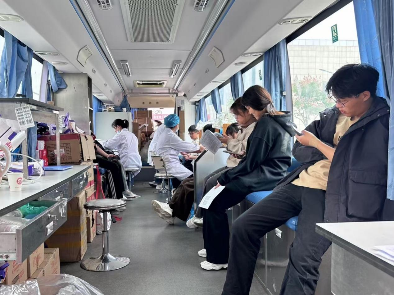 图为学生们在献血车里献血的现场。任子慧供图