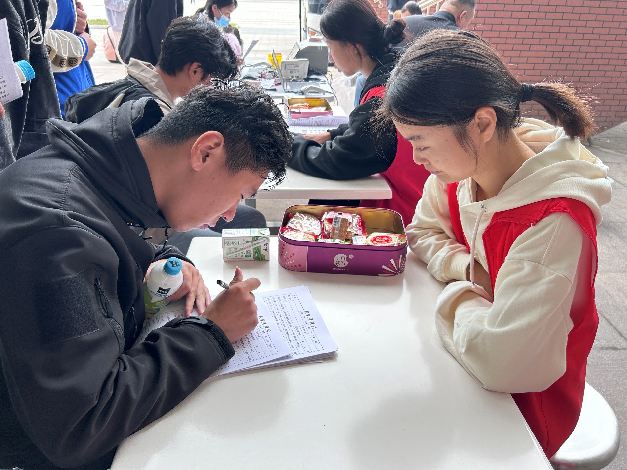 图为志愿者在为献血学生做登记。任子慧供图